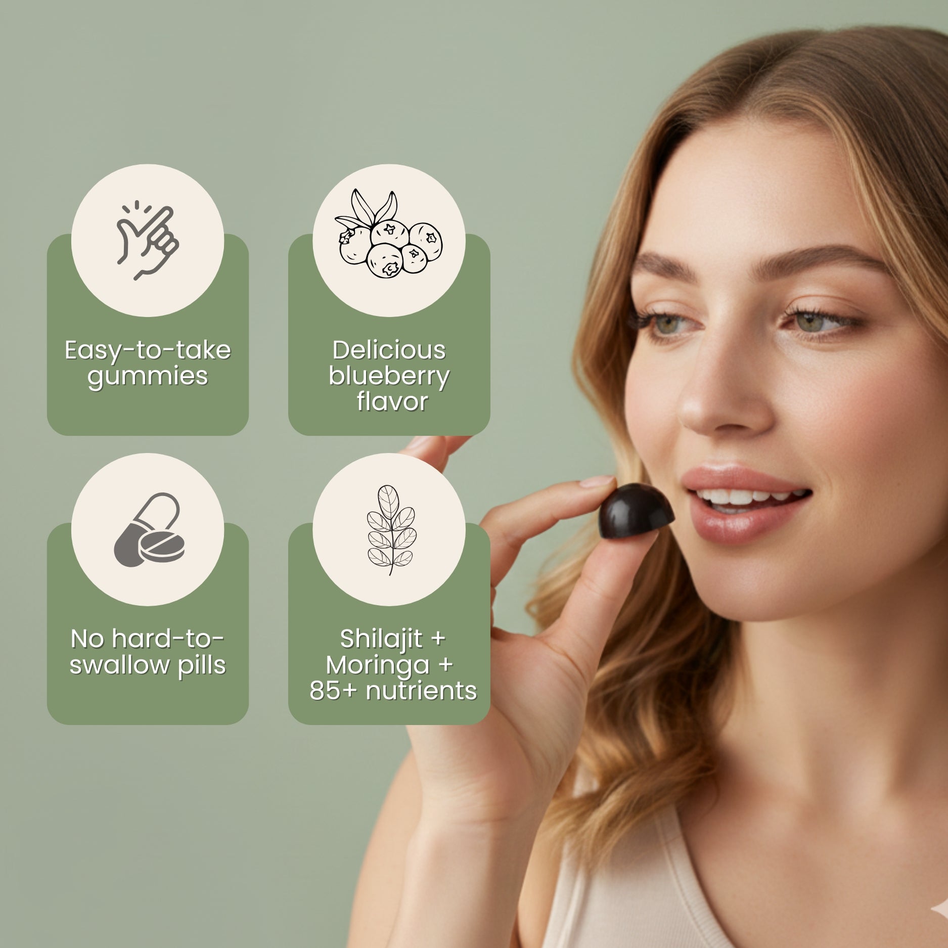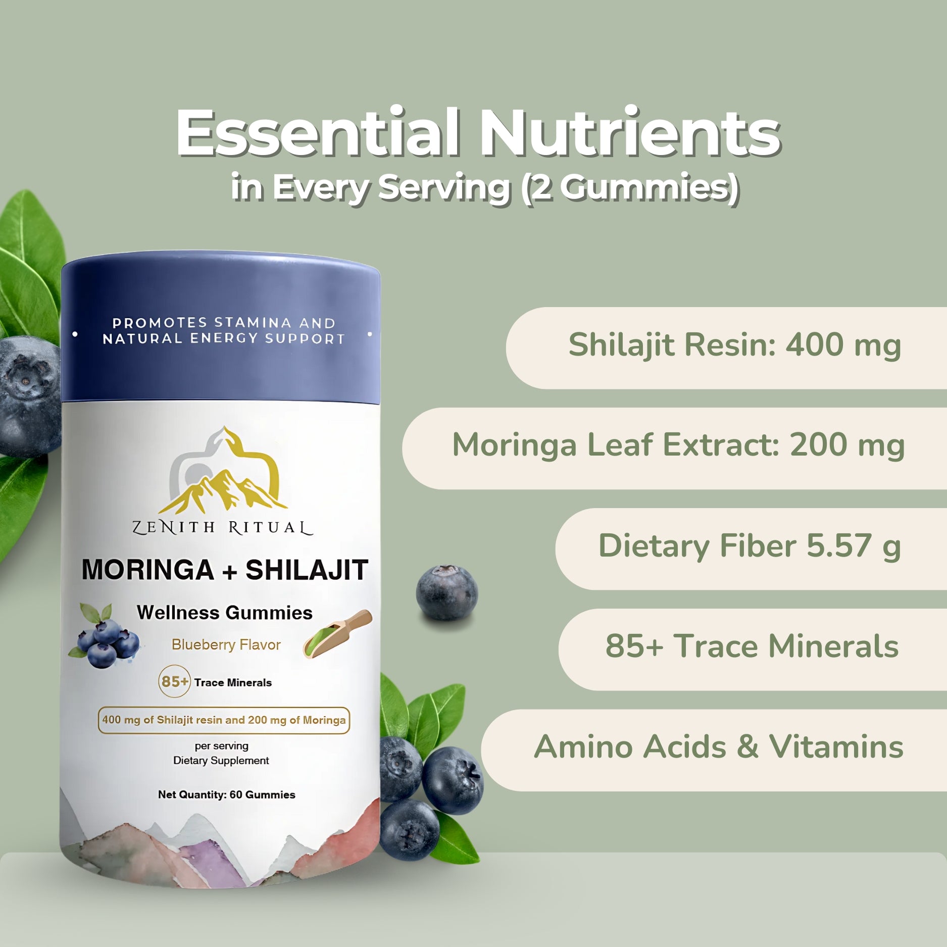 Zenith Ritual gummies are a daily wellness supplement crafted with 400mg of purified Himalayan Shilajit resin and 200mg of Moringa Leaf Extract. They support energy, immunity, stress relief, and overall vitality — all in a delicious elderberry-flavored gummy.