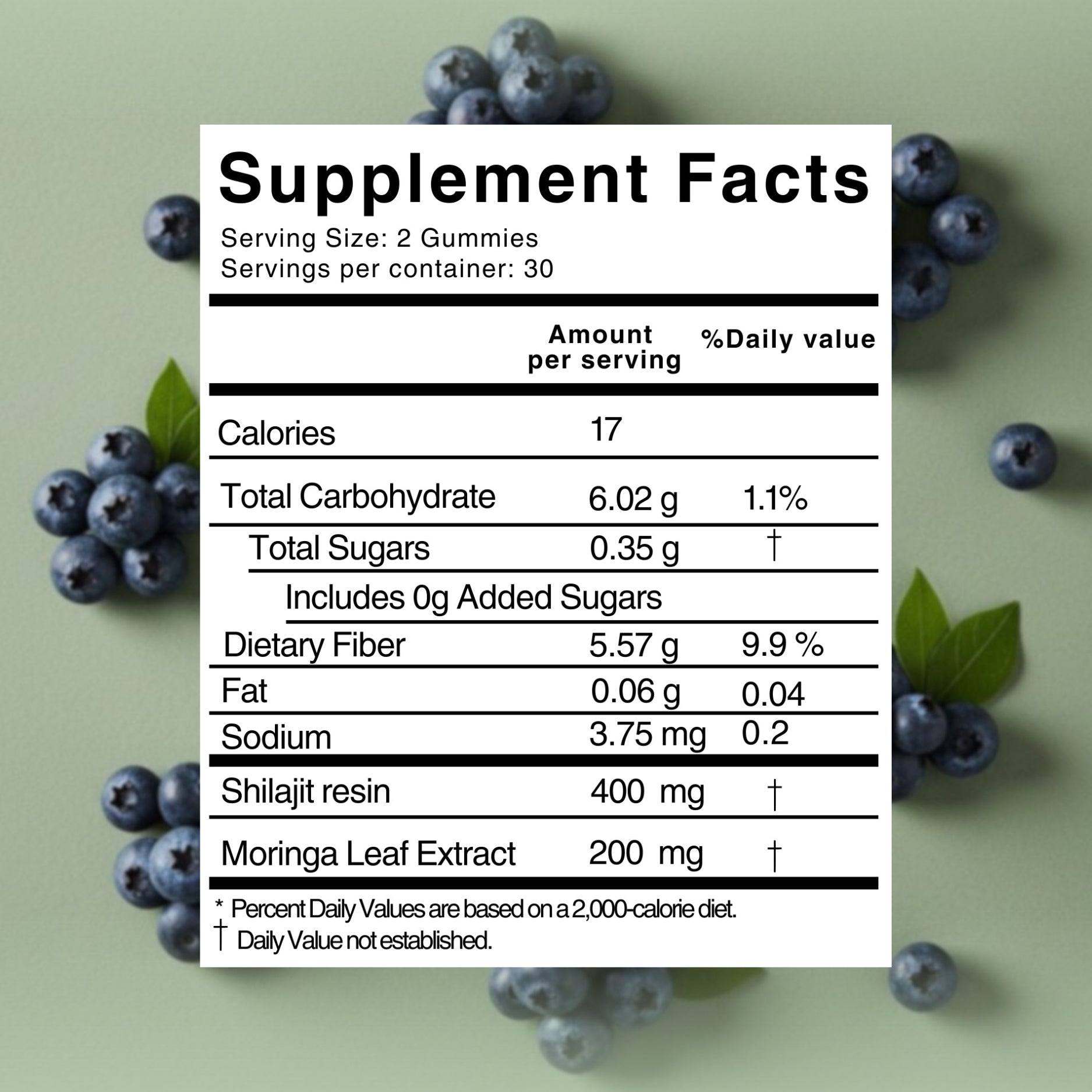 Each Zenith Ritual gummy delivers 400 mg of pure Himalayan Shilajit resin and 200 mg of nutrient-rich Moringa leaf extract—carefully blended with prebiotic fiber (Fossence) to support gut health and infused with MCT oil to enhance mental clarity and focus.