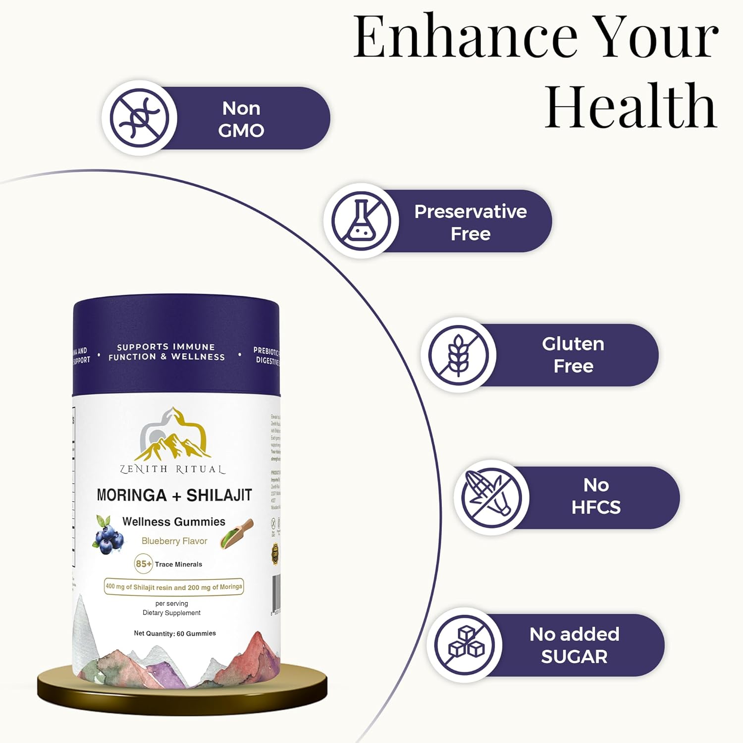 Zenith Ritual Shilajit & Moringa Gummies are a dietary supplement in blueberry flavor, made with Himalayan shilajit resin and moringa leaf extract.
